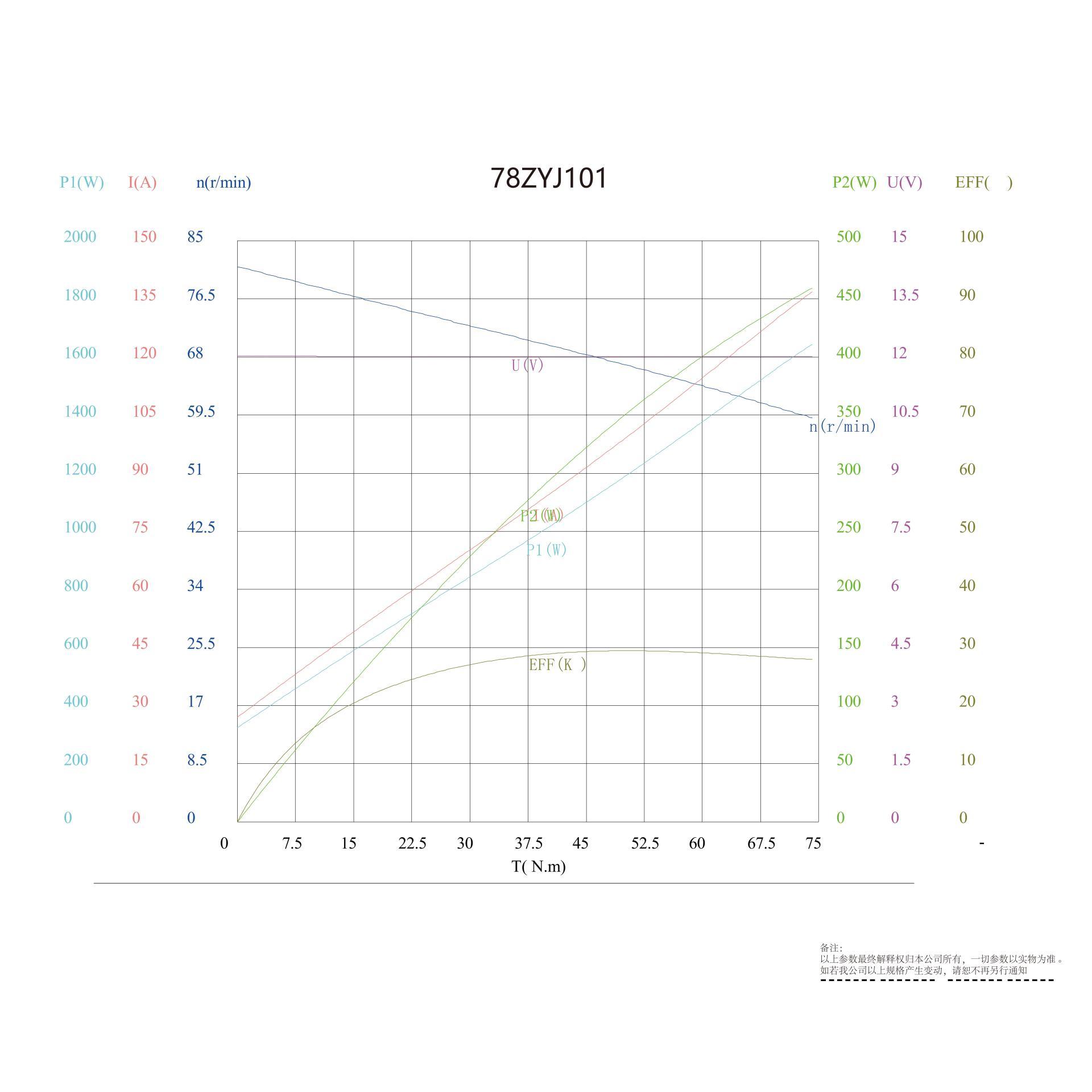 Motor Data Units Part No. 78ZYJ101 額定電壓 VDC 12 額定電流 A 105 額定轉(zhuǎn)矩 Nm 65 額定轉(zhuǎn)速 rpm 53 額定功率 W 360 空載轉(zhuǎn)速 rpm 70 減速比 / 60:1 特性曲線