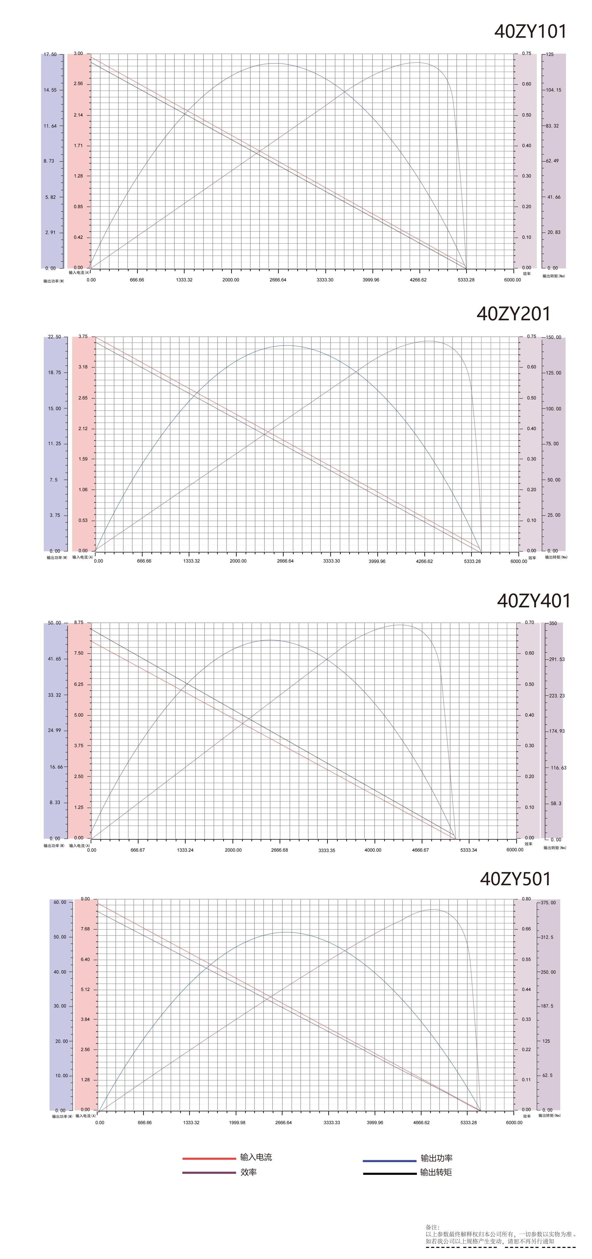 Motor Data Units Part No. 40ZY101 40ZY201 40ZY401 40ZY501 額定電壓 V 24 24 24 24 額定電流 A 1.35 1.32 2.14 2.77 連續(xù)轉(zhuǎn)矩 N.m 0.031 0.041 0.074 0.098 連續(xù)轉(zhuǎn)速 rpm 4000 4000 4000 4000 額定功率 W 13 17 31 41 空載電流 A 0.15 0.18 0.25 0.18 空載轉(zhuǎn)速 rpm 5200 5200 4920 5230 堵轉(zhuǎn)電流 A 6.09 5.54 9.64 13 堵轉(zhuǎn)轉(zhuǎn)矩 N.m 0.222 0.117 0.436 0.542 反電勢(shì)常數(shù) V/KRPM 4.6 4.6 4.8 4.4 電機(jī)重量 Kg 0.252 0.29 0.39 0.44 機(jī)身長(zhǎng)度L mm 57 62 79 86 性能曲線