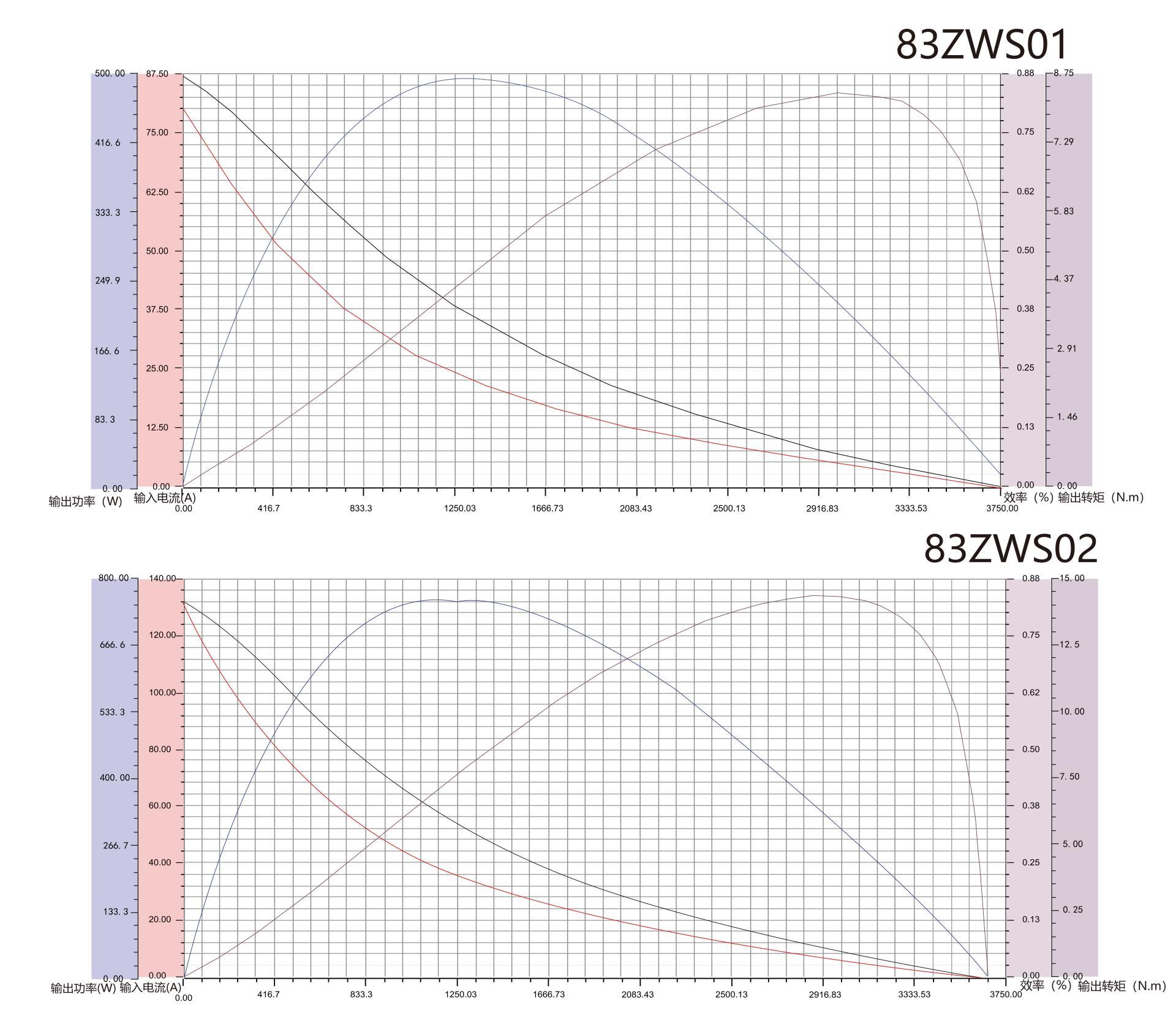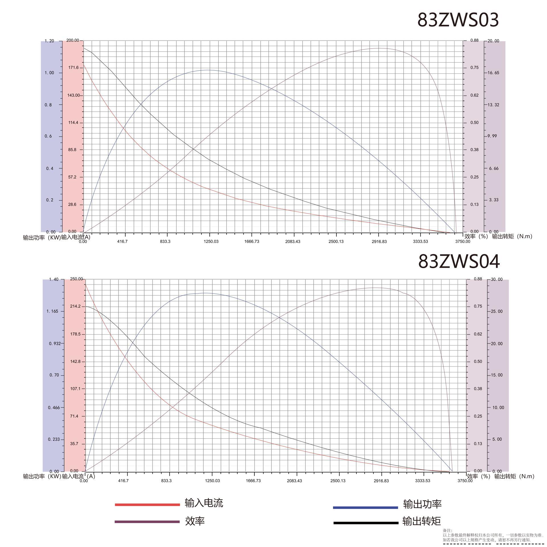 Motor Data Units Part No. 83ZWS01 83ZWS02 83ZWS03 83ZWS04 額定電壓 V 48 48 48 48 額定電流 A 5 7.28 10 11.6 額定轉(zhuǎn)矩 Nm 0.63 0.95 1.31 1.52 額定轉(zhuǎn)速 RPM 3600 3600 3600 3600 額定功率 W 237 358 494 573 空載轉(zhuǎn)速 RPM 3754 3763 7600 7550 峰值轉(zhuǎn)矩 Nm 1.89 2.85 3.93 4.56 峰值電流 A 12.42 18.05 24.4 27.98 反電勢(shì)常數(shù) V/KRPM 12.79 12.76 6.32 6.35 工作制 / S1 S1 S1 S1 機(jī)身長(zhǎng)度L mm 77.4 90.1 102.8 115.5 特性曲線